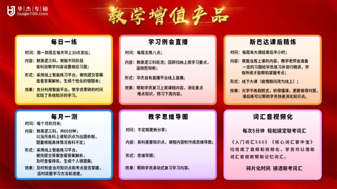 在学习过程中,大家难免在课后有题目或知识点不会做,华杰配置老师专门解答同学们的疑问,同时还享有华杰自主研发的教学增值服务,它在帮助华杰学员在养成高度自律的学习习惯上起到了非常重要的作用。